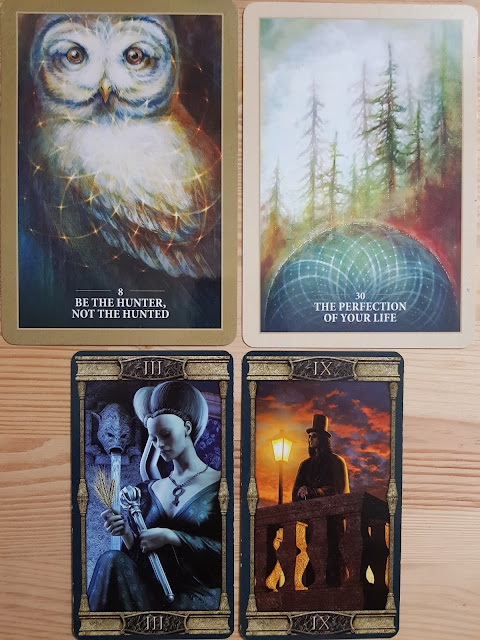 This leads to the next card, The Hermit, advising to take time out alone so to receive further insights from the universe. Not to be swayed by the opinions of others however well intentioned they are.